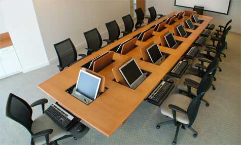 Masa consiliu realizata la comanda din pal melaminat, canturi ABS, masa pentru sedinte prevazuta cu un sistem inovativ pentru integrarea pc-urilor. Doar cu mobilapecomanda.com , contactati-ne !