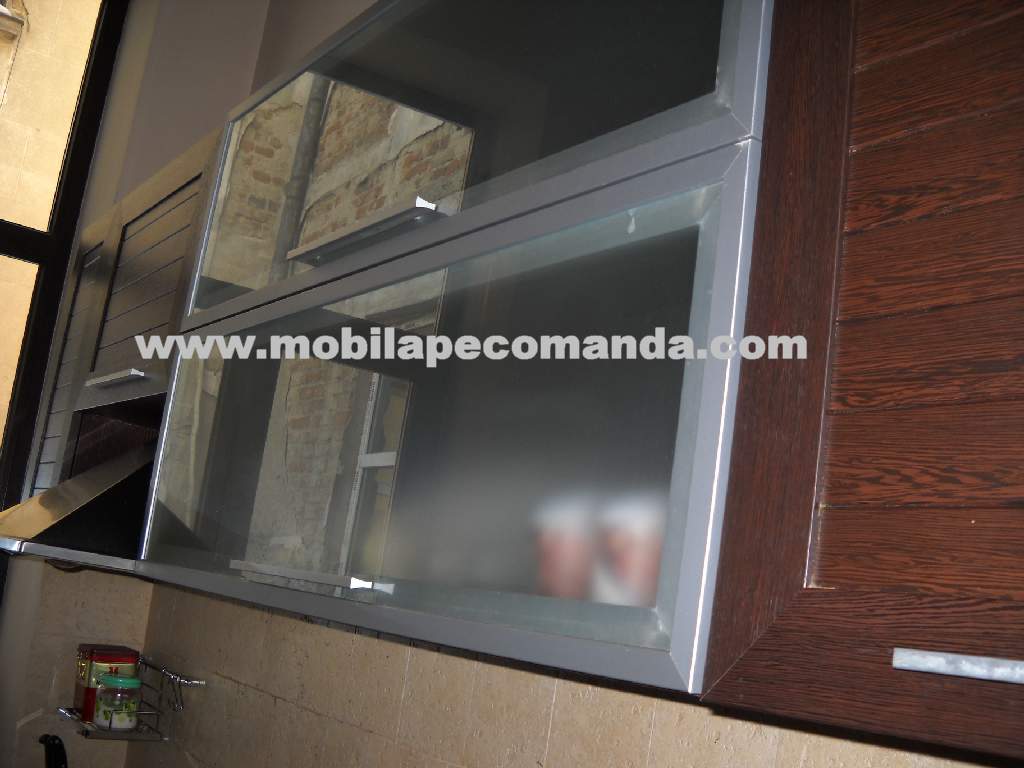 Usi cu geam sablat si rame aluminiu prevazute cu sistem de deschidere pe piston cu gaz pentru amortizare.
