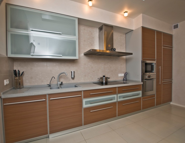 Design modern oferit de usile cu geam sablat si rame aluminiu, manere aluminiu pentru sertare si usi.