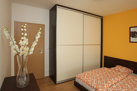Mobilier pentru dormitor la comanda, dulap cu usi glisante pe sine aluminiu, rame usi aluminiu, geam sablat, feronerie Austria.