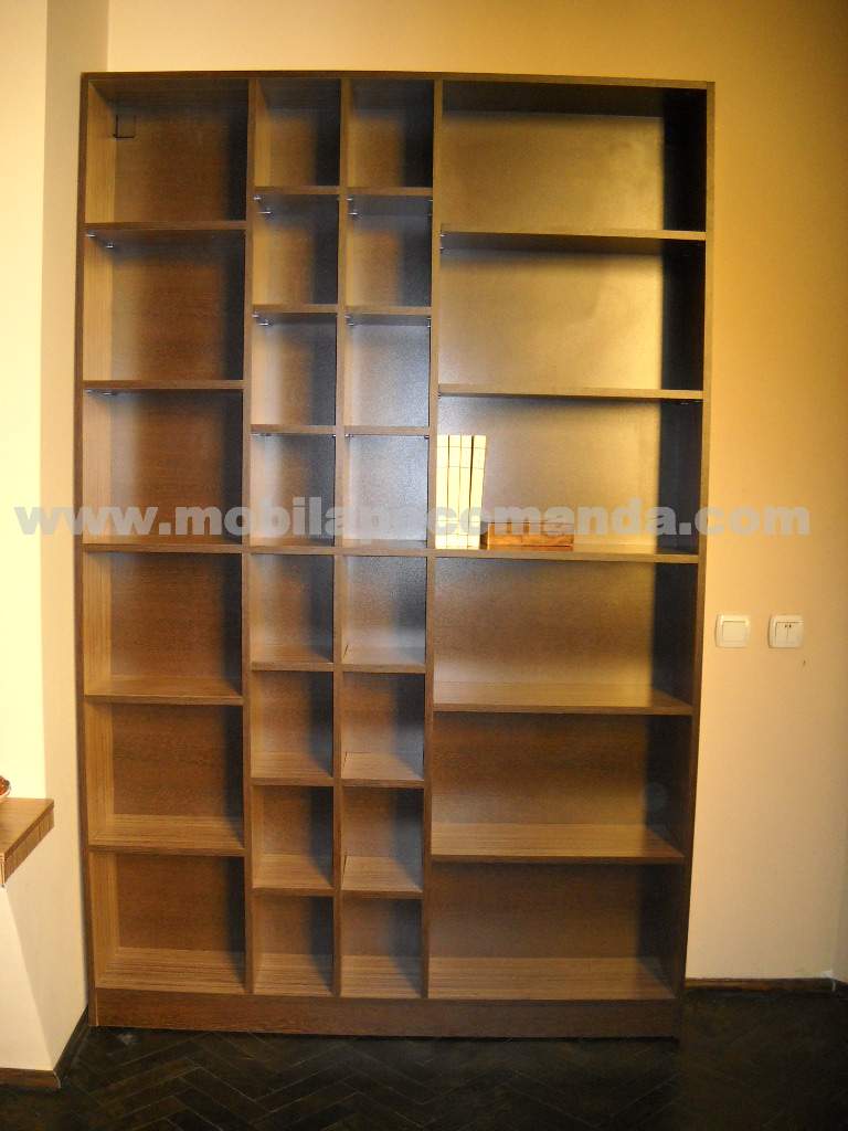 Biblioteca realizata din pal melaminat finisaj venghe cu zebrano, sistem de prindere ascuns, dimensiuni la cerea clientului.
