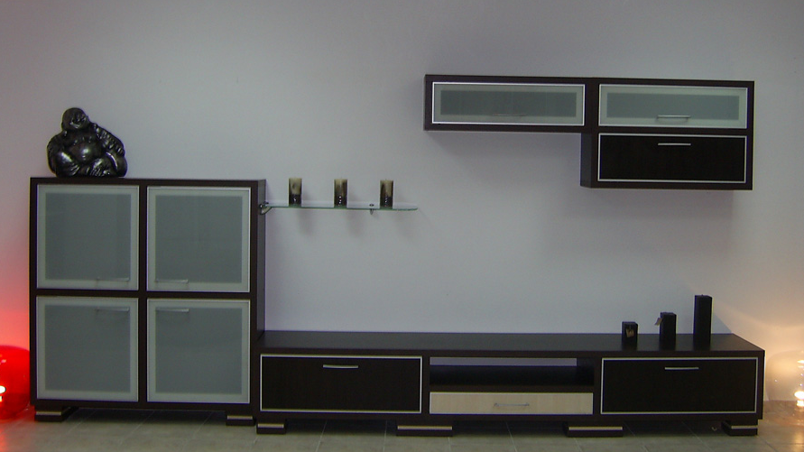 Mobila living realizata la comanda din pal melaminat si geam sablat, profile aluminiu, seratre cu glisiere Blum, usi prevazute cu sistem de deschidere pe piston pe gaz pentru amortizare.