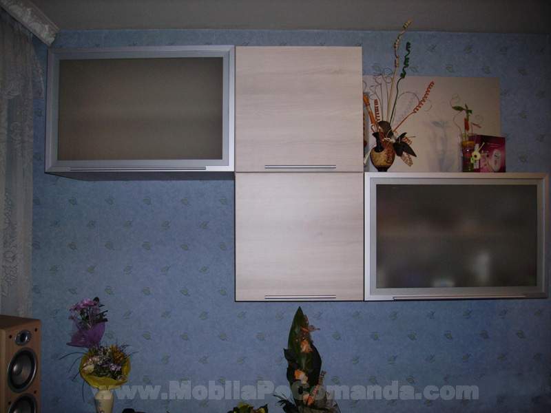 Corpuri pe perete din pal melaminat si geam sablat, rame usi aluminiu, manere din aluminiu, deschidere a usilor in sus pe pistoane cu gaz.